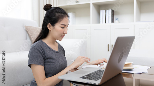 Asian woman working at home on weekends, Press the calculator to calculate the income - expenses of the house and use the laptop to record the information and check the accuracy, Home lifestyle.