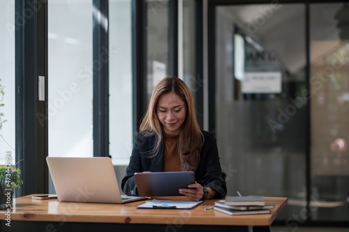 Asian woman working digital tablet and laptop computer. Smiling female busy working at office