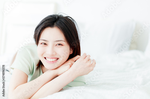 woman, happy, laughing, chinese, bed, laugh, asian, young, home, smile, smiling, home, japanese, korean, 20, 30, portrait, single, person, 1, beautiful, beauty, elegant, lovely, short hair, black hair, lively, play, bedchamber, lying, white, sleep, sleeping, pillow, morning