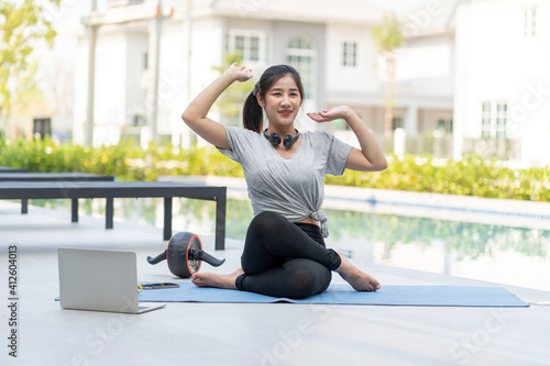 Asian women learn to practice yoga and stretch on their laptops, taught by the poolside in the Spore Club. Workout form home and work out concept.