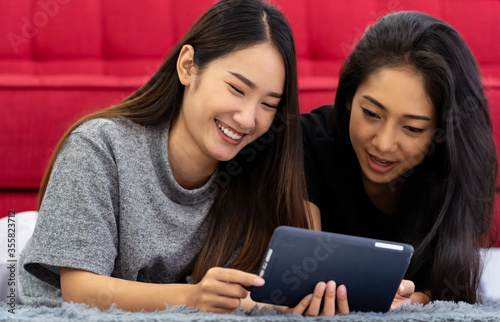 tablet, woman, living room, lifestyle, asian, cheerful, home, casual attire, smile, lying, attractive, living, female, indoor, rug, armchair, sofa, together, cute, leisure, lesbian, relaxation, cyberspace, comfortable, relaxing, indonesian, online, health care, mental, relax, apartment, technology, young, television, 2, girl, household, touch screen, watching, life, domestic, digital, smiling, happy, couch, sitting, woman