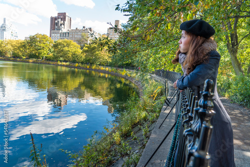 Asian women tourists go to see the city view reflecting water at the pond in Central Park