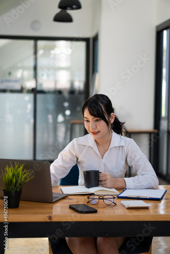 Asian women Work on laptops, computers, and tiger skins at the desk. Small business owners, employees, online, freelance, SME marketing, eCommerce, finance, office marketing ideas.