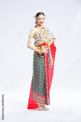 Asian young female portrait beautiful bride woman in vintage traditional Thai costumes, gold and red color dress, standing smile looking camera isolated white background studio