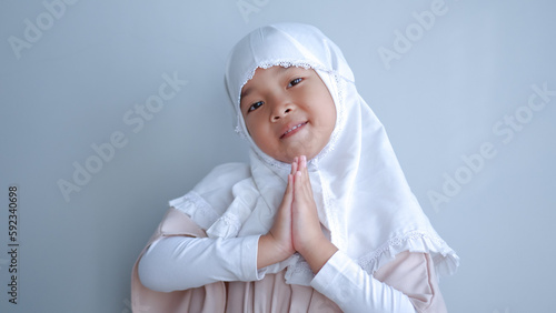 Asian young girl in hijab posing greeting hand gesture. Ramadhan and eid al fitr concept.
