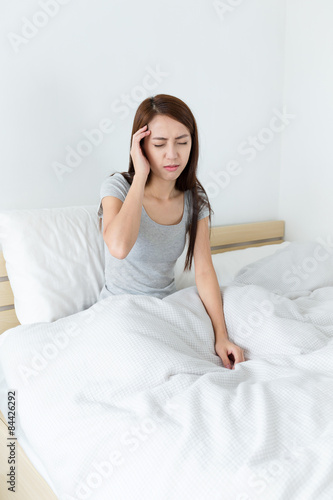 woman, lady, girl, female, japanese, korean, chinese, asia, asian, tee, sport, pajama, casual attire, wear, relax, cephalalgia, head, pain, painful, stress, sleepy, fatigue, ill, disease, unhealthy, sick, depression, bed, room, bedchamber, living, interior, sleep, home, house, bedtime, white, pillow, comfort, careless, rest, mattress, morning, to sit, down, seat