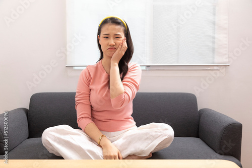 Asian young woman sitting on the sofa at home with painful expression because of toothache or dental illness on teeth.