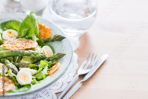 Asparagus Salad with quails eggs and cheese crisps