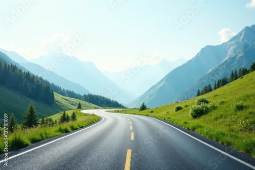 Asphalt Ribbon Unfolding Through Verdant Mountain Slopes Under a Bright Sky