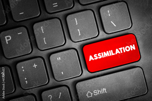 Assimilation - process whereby individuals or groups of differing ethnic heritage are absorbed into the dominant culture of a society, text button on keyboard, concept background