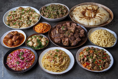 food, asian, dish, meal, platter, cookery, variety, delicious, tasty, plate, eatery, dinner, lunch, homemade, cooked, meat, noodle, dumpling, vegetable, spice, sauce, stir fry, gravy, broth, pork meat, beef, lamb, chicken, rice, pasta, bread, main, course, side, dish, healthy, portion