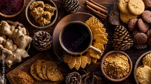 cookie, natural, flat, autumn, ginger, baked, cup, breakfast, tea, arrangement, herb, table, dessert, dried, fall, hot drink, healthy, gold, brown, treat, snack, cone, lay, pine, nut, top, food, view, spice, wooden, biscuit, delicious, seasonal, decorative