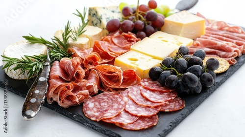 Assorted charcuterie board featuring cheese, cured meats, and grapes on a slate platter.