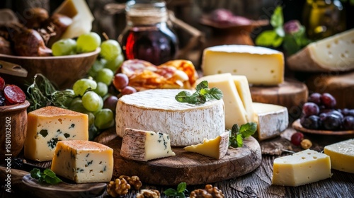 Assorted cheeses fruits and nuts on rustic wooden board for gourmet food photography and culinary lifestyle product branding