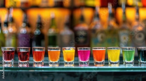 Assorted colorful bitters and liqueurs in shot glasses on bar counter