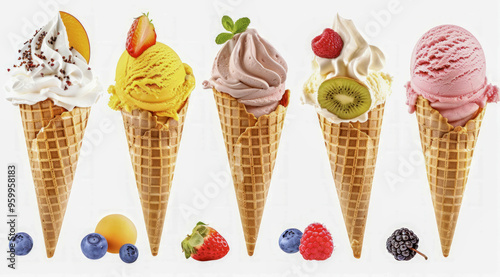 ice cream, cone, colourful, assorted, dessert, sweet, food, cold, waffle, scoop, fruit, raspberry, blueberry, strawberry, kiwi, lemon, summer, glacé, treat, creamy, delicious, fresh, vanilla, berry, sorbet, epicure, snack, dairy, refreshing, cool, favor, indulgence, variety, vibrant, tasty, fruity, chilled