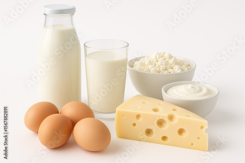 Assorted dairy items and eggs displayed on a plain white backdrop