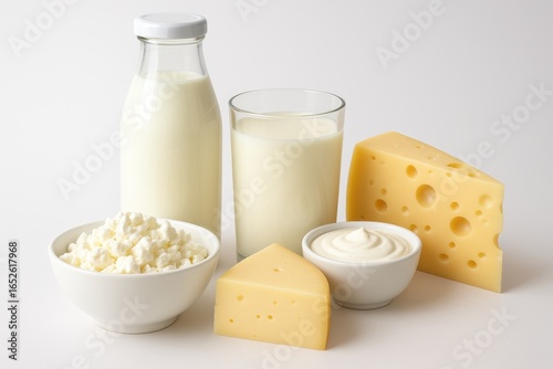 Assorted dairy products displayed against a white backdrop