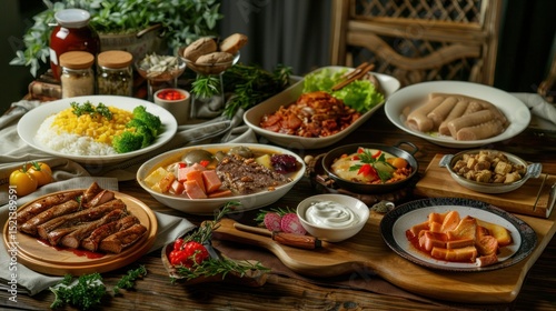 Assorted dishes served on a wooden table stock photo --ar 16:9 --raw --v 6 Job ID: 03831667-6ab4-48f4-95fa-7542cce370c3
