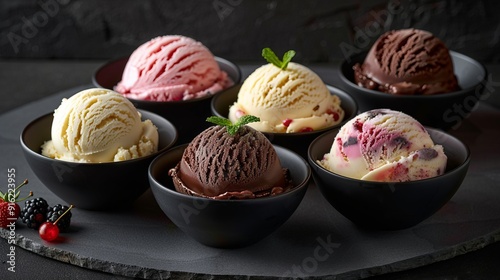 ice cream, favor, dessert, bowl, dark, assorted, sweet, scoop, delicious, ice cream, food, glacé, colourful, summer, cold, creamy, fresh, plate, fruit, strawberry, scoop, vanilla, raspberry, mint, garnish, decoration, epicure, topview, indulgent, artisanal, sugar, favor, berry, refreshing, treat, culinary, gourmet food, tasty, ice, chill, black plate, artistic, presentation, cream, freshness
