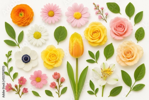 Assorted floral and foliage collection on a white backdrop, showcasing spring flower designs for romantic occasions and weddings, featuring cutting techniques.