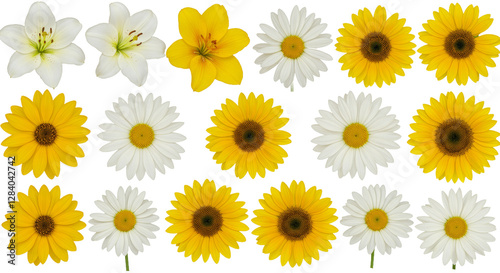 flower, floral, bloom, blossom, nature, spring, summer, yellow, white, isolated, transparent, background, cut-out, lily, daisy, sunflower, arrangement, decorative, element, design, botanical, botany, flora, garden, fresh, vibrant, colourful, natural, seasonal, beauty, beautiful, closeup, macro, detail, graphic, illustration, clip art, vector, art, artwork, digital, collection, set, group, pattern, texture