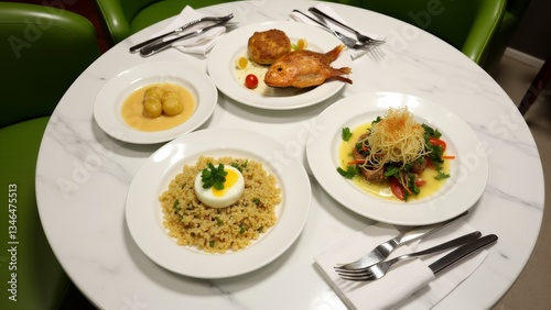 food, cookery, dish, meal, plate, table, round table, assorted, variation, egg, fish, salad, rice, snack, lunch, dinner, eatery, cafes, fine dining, epicure, culinary, tasty, delicious, appetising, prepared, presentation, artistic, food photography, cutlery, fork, knife, spoon, closeup, indoor, modern, style, serving, portion, luxury, elegance, arrangement, tomatoes, herb, vegetable, dining, eat, balanced diet