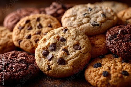 Assorted fresh baked cookies with chocolate chips and chewy textures. Use it for baking blogs, dessert recipes, or food photography projects.
