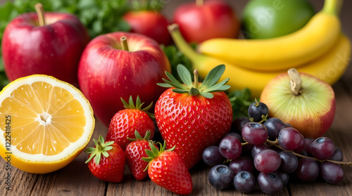 Assorted fresh fruits on wooden background for healthy eating.