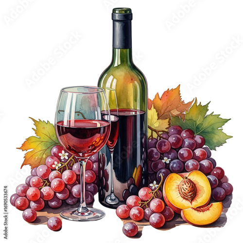 wine, glasses, grape, peach, fruit, bottle, autumn, leaf, red, green, table, drink, alcohol, vinery, harvest, elegant, still, life, arrangement, flocked, juicy, sweet, tart, refreshing, vintage, celebration, dinner, party, epicure, luxury, taste, favor, aroma, stem, vine, ripe, fresh, organic, natural, beverage, relaxation, enjoyment, feast, picnic, summer