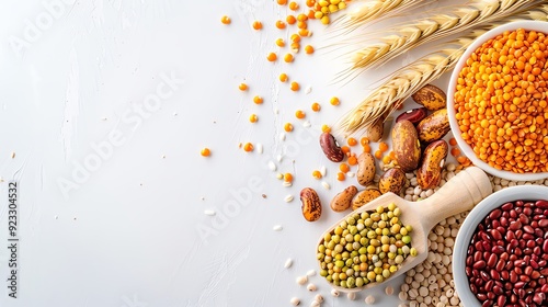 Assorted grains and legumes including lentils, dates, and wheat on a white background, emphasizing healthy, natural, and organic food choices.