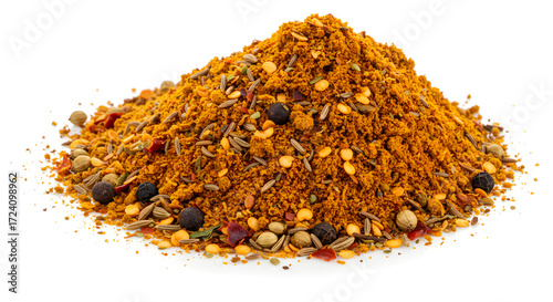 Assorted ground Masala spices arranged in a pile on white background