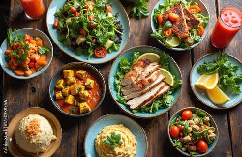 Assorted healthy dishes on wooden table. Various bowls with nutritious food, salads, grilled chicken, vegetables, mashed potatoes, tomato mix. Fresh greens, citrus slices as garnish. Nutritious meal