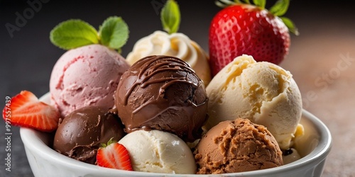 Assorted ice cream scoops in a white bowl: chocolate, vanilla, strawberry, isolated on white background
