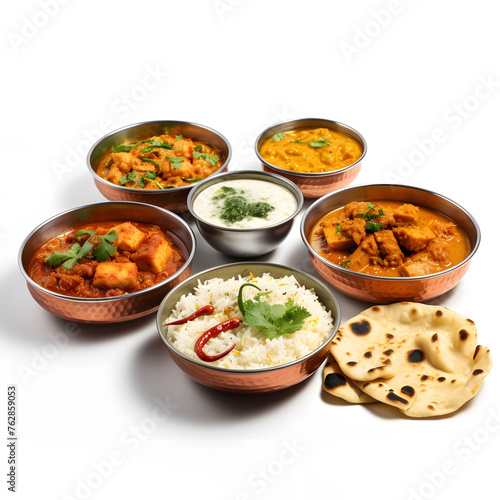 Assorted Indian dishes in copper bowls on a white background. Indian cuisine concept. Design for restaurant menus, food blogs, and culinary guides.