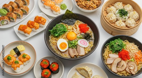 Assorted Japanese food dishes including sushi ramen and dumplings on a white surface.