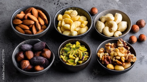 Assorted nuts in bowls, on gray background, for snack, health food advertising