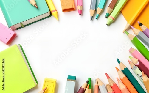 Assorted office and school white orange and green stationery supply on pastel trendy background as knolling. Copy space. Flat lay for back to school or education and craft concept. High quality