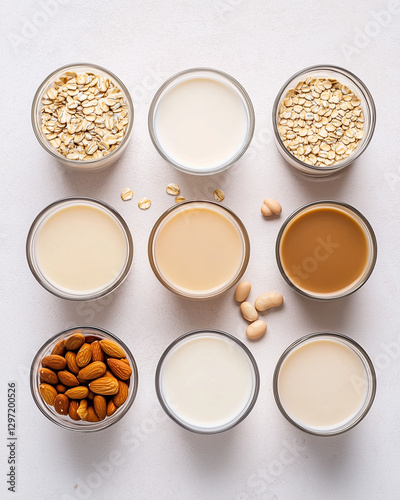 vegan, almond milk, healthy, organic, nourishment, glasses, creamy, wholesome, homemade, fresh, protein, smooth, vegetarian, wellness, sustainable, environmentally friendly, breakfast, minimalistic, modern, food photography, topview, natural, variety, selection, beverage, healthy lifestyle, balanced diet, isolated, white, set, ingredient, bowl