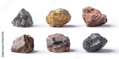 Assorted rocks displayed against a white background. Different shades of gray, brown, and yellow-orange, various textures