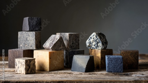 Assorted rough stone blocks arranged on wooden surface for geology construction material architecture texture photo background