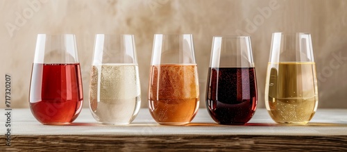 Assorted stemless glasses in red, white, and rose, alongside a classic champagne flute.