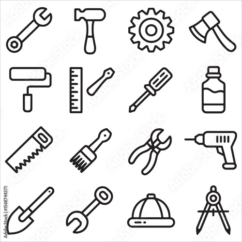 tool, icon, wrench, hammer, saw, compass, drill, construction, repair, building, gear, axe, ruler, screwdriver, bottle, paintbrush, plier, shovel, hard hat, hardware, equipment, instrument, fix, maintenance, carpenter's shop, engineering, industry, do it yourself, home improvement, outline, vector, clip art, graphic, symbol, design, illustration