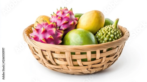 fruit, basket, still life, healthy eating, food, tropical fruit, mango, green fruit, sweet, nourishment, vitamin, delicious, diet, health, fresh, raw, closeup, studio shot, white background, dragon fruit, ripe, vegetarian, vegan, organic, natural, antioxidant, exotic, sweetness, produce, tropical, arrangement, full frame, no people, single object, tabletop, woven basket, health care, wellness, colourful, vibrant, refreshing, isolated, presentation, display, nourishment, immunity, detox