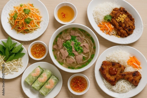 Assorted Vietnamese Cuisine Served on a White Plate with Side Dishes, Top View of a Group Meal