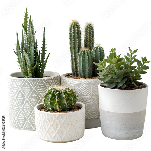 Assortment of Cacti and Succulents in Stylish Ceramic Pots on transparent Background