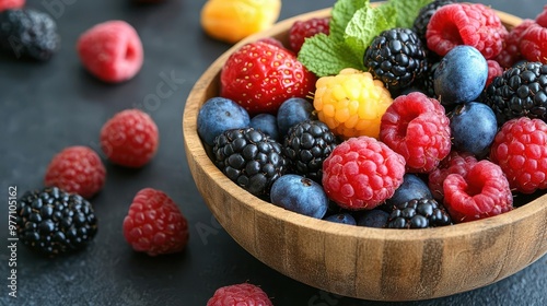 Assortment of colorful berries in a wooden bowl, rich in antioxidants, brain health focus