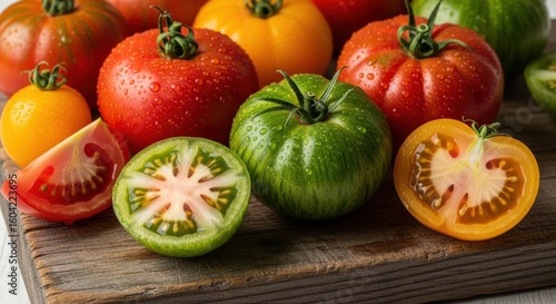 tomatoes, heirloom, colourful, variety, red, green, yellow, orange, sliced, whole, fresh, ripe, produce, food, vegetable, wooden, board, rustic, texture, vibrant, colours, garden, harvest, agriculture, farming, healthy, nourishment, diet, raw, vegetarian, vegan, organic, natural, closeup, still life, culinary, cooking, ingredient, market, grocery, plant, flora, botany, stem, leaf, juicy, delicious, edible, background