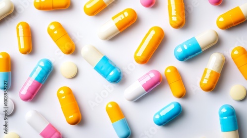 Assortment of Colorful Pharmaceutical Capsules and Tablets on Plain Background
