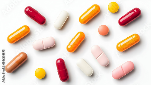 pill, medicine, drug, capsule, tablet, pharmaceutical, health, medication, colourful, orange, red, white, pink, yellow, brown, medicals, health care, pharmaceutical, chemist's shop, prescription, therapy, treatment, vitamin, supplement, drug, nourishment, wellness, healthy, care, body, lifestyle, pharmacy, isolated, white background, topview, medical supplies, medical treatment